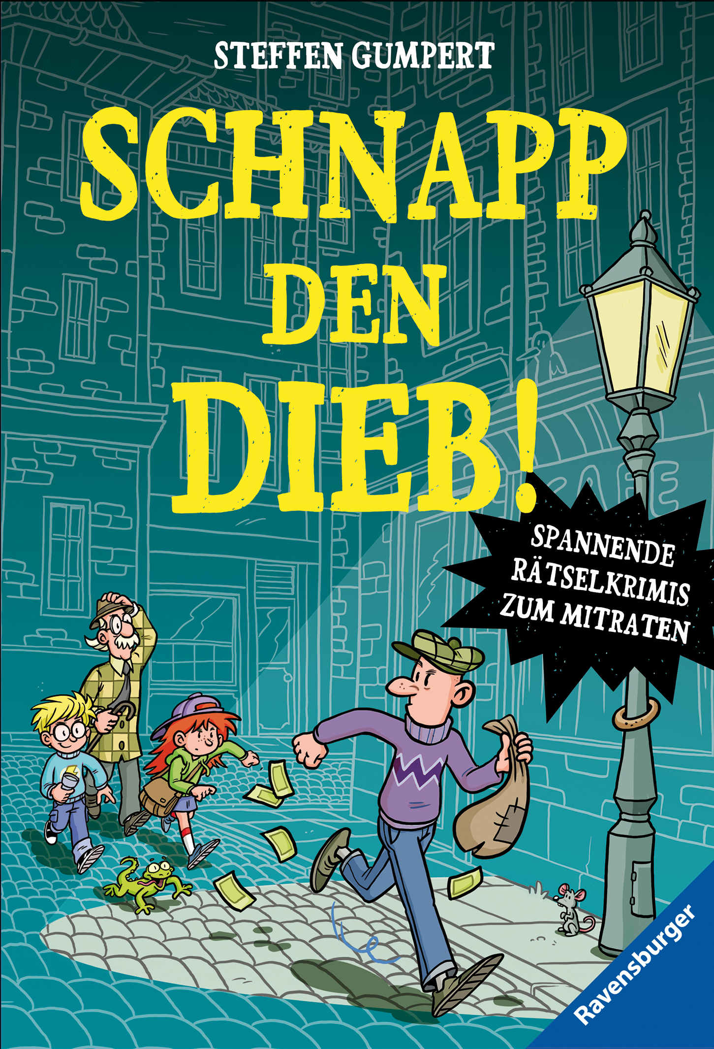 Dadurch hat Steffen natürlich auch ein unglaublich breit gefächertes Portfolio, das Ihr Euch unbedingt mal ansehen solltet. Gerade ist seine kleine, aber feine Rätselkrimi-Sammlung Schnapp den Dieb bei Ravensburger erschienen; darin gibt es fünf Abenteuer von und mit Polizeiinspektor Kieselklein, Lilo, Tilo und Gecko Gurke, die das Antolin-Punktekonto des Monsieur 2 weiter ansteigen lassen werden…