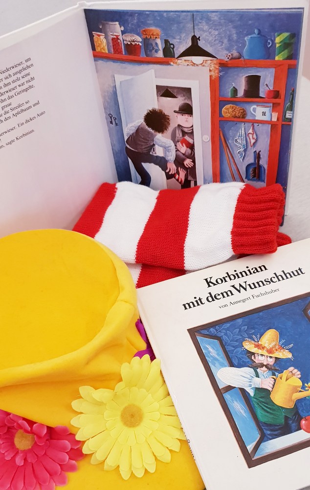 Eines Morgens findet Korbinian, ihr habt es erraten, einen Wunschhut. Korbinian, der neue Eigentümer des Hutes, wünscht sich einige merkwürdige Sachen: z.B. einen Apfelbaum in seiner Wohnung, Socken ohne Füße und einen schwarzen Schirm, mit dem er fliegen kann. All diese Utensilien – ein gelber Hut mit Blumen, rot-weiß geringelte Stulpen, Äpfel und einen Regenschirm – kann man schauspielerisch in die Lesung einbauen. Seine Nachbarn halten Korbinian für einen Dummkopf. Doch Korbinian weiß, was ihn glücklich macht und weil er alles hat, was er braucht, wirft er den Hut schließlich zum Fenster hinaus.