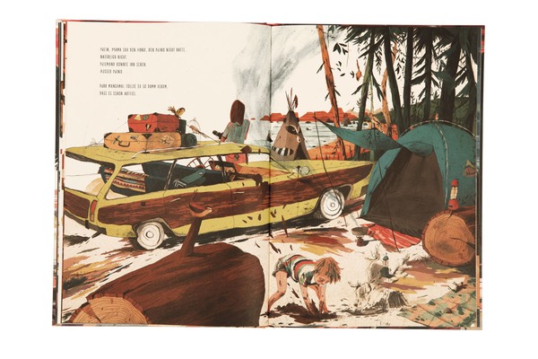 Eingebettet ist die Geschichte von Nino in eine überwältigende Komposition fluider Bilderlandschaften, die aus unzähligen kleinen Details und braun-rot-grünen Farbtönen zusammengesetzt sind. Wie in einem Van Gogh-Gemälde fließen die einzelnen wunderschönen Bildelemente ineinander und jede Seite schwappt farblich und kompositorisch in die nächste Seite hinein. So schwimmt, schwebt, fühlt und fliegt man durch die Geschichte, in der auch die Grenzen zwischen Imagination und Wirklichkeit, zwischen Innen- und Außenwelt verschwimmen. Hier und da schimmert eine traurige und melancholische Stimmung durch, die sich am Ende jedoch in einer genauso fröhlichen wie überraschenden Versöhnung zwischen Vorstellungskraft und Realität auflöst.