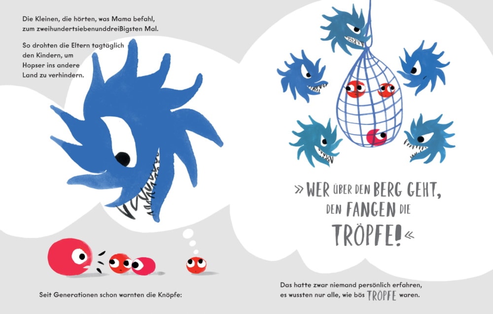 Doch, Moment! Wieso sollte jemand die Tröpfchen gefangen nehmen, es waren doch nur die Knöpfchen bedroht? Bei weitem nicht. Dazu wenden wir das Buch Die Knöpfchen und die Tröpfchen und lesen die Geschichte der Tröpfchen. Diese leben am fröhlich am Fuße eines Berges, doch werden seit Generationen gewarnt, ja nicht auf die andere Seite zu hüpfen, denn dort lauern die bösen Knöpfe…