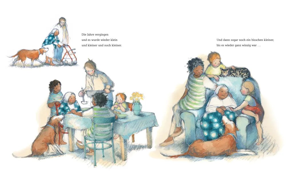 Wer poetische Bücher mag, liegt mit Wenn ein Stern vom Himmel fällt richtig: Es erzählt die Geschichte eines behüteten Lebens von der Geburt bis zum Tod. Ein kleiner Stern fällt vom Himmel und wird zu einem Baby. Dieses wird größer und älter, ist irgendwann erwachsen und bekommt selbst Kinder. Der Stern genießt sein Leben in vollen Zügen, versammelt Familie und Freund:innen um sich und wird dann langsam wieder immer kleiner, bis er eines Tages die Erde verlässt und wieder am Himmel funkelt.