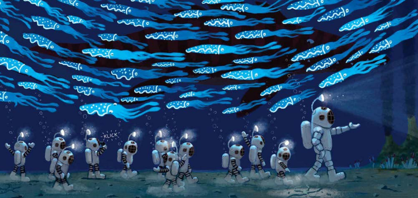 Auch Tief im Ozean ist ein Nachfolgebuch, und zwar des vielfach ausgezeichneten Ausflug zum Mond, ebenfalls ein sogenanntes Silent Book – ein Buch, das ohne Worte auskommt und damit viel Raum für Fantasie, Sprachentwicklung und Leseförderung lässt.