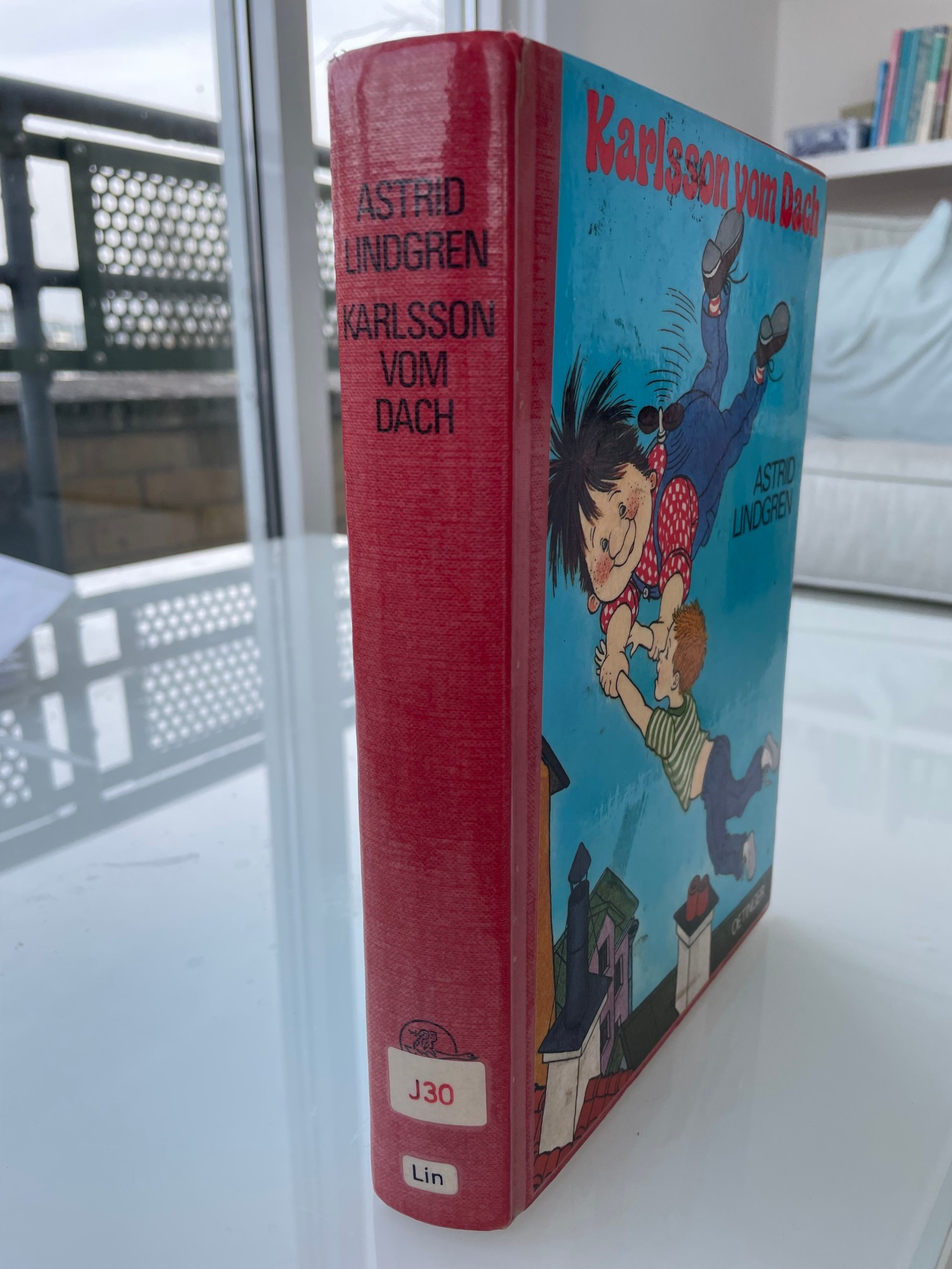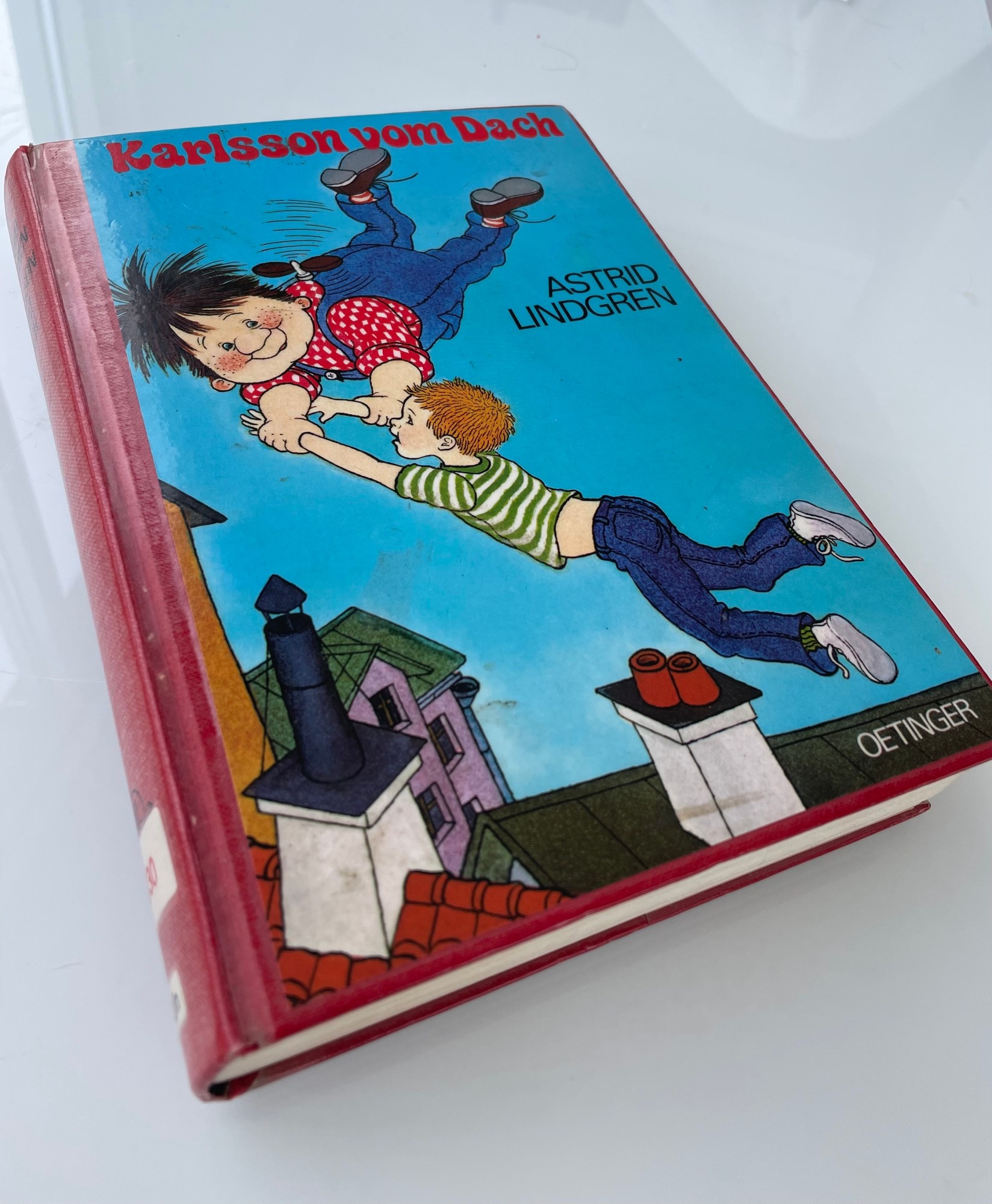 Gerne würde ich den anarchistischen Einfluss, den Karlsson auf mich ausgeübt hat, etwas übertreiben und sagen, ich hätte meine Ausgabe (siehe Fotos) aus der Bücherei geklaut. Man sieht ja noch den Aufkleber. Die Wahrheit ist, dass die katholische Kirchenbücherei dem traurigen Schicksal der Schließung zum Opfer fiel. Die verbliebenen Bestände wurden verkauft. Ich stand als Allererste in der Schlange, Karlsson fest in meiner Hand, und habe das Buch rechtmäßig mit meinem Taschengeld erworben.