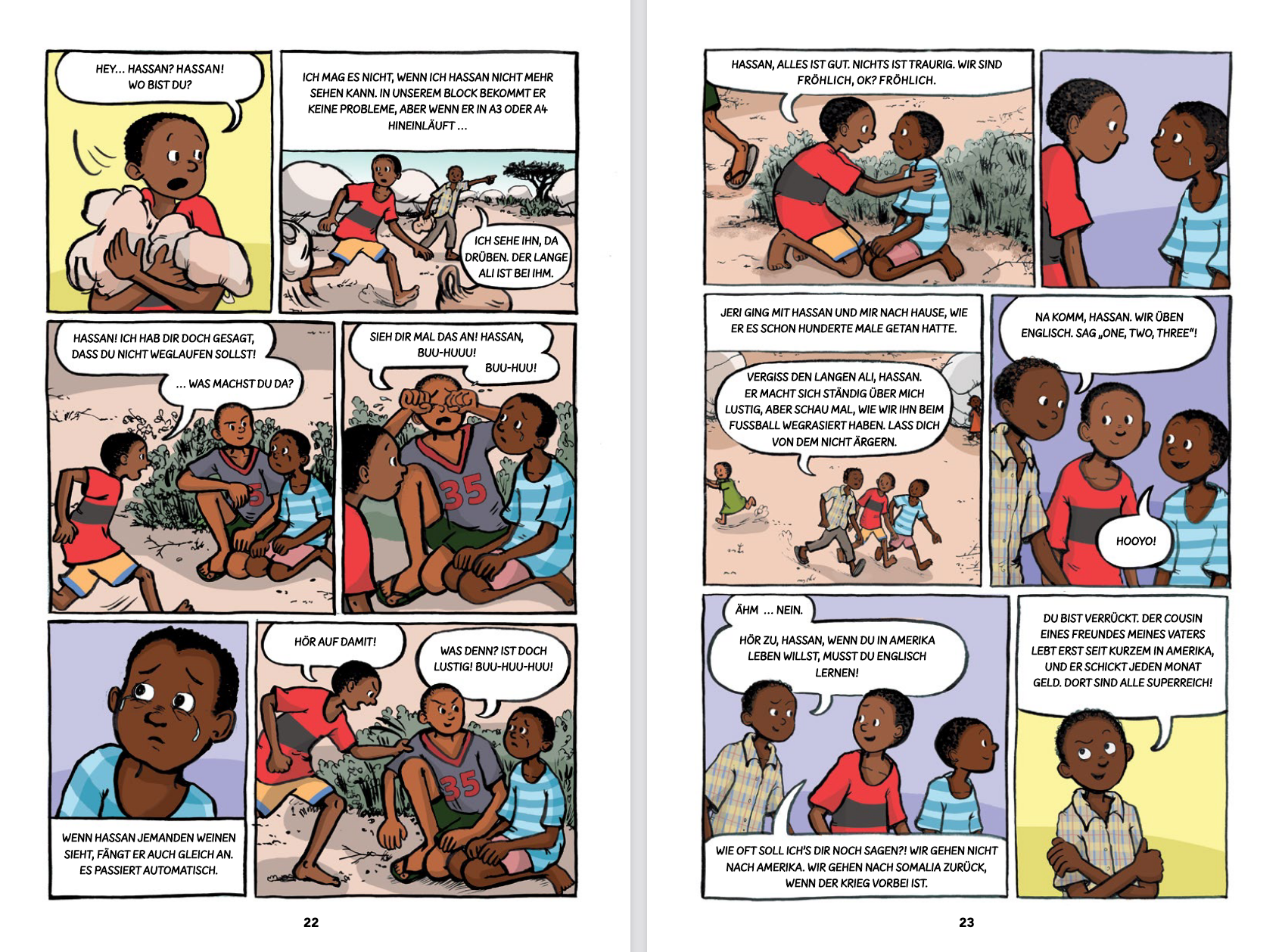 Eines Tages bekommt der kluge Junge die Möglichkeit, die Schule im Flüchtlingslager zu besuchen und ist hin und her gerissen: Wer passt auf Hassan auf, wenn er im Unterricht sitzt? Aber wäre schulische Bildung vielleicht auch die Chance, irgendwann Dadaab verlassen zu können?