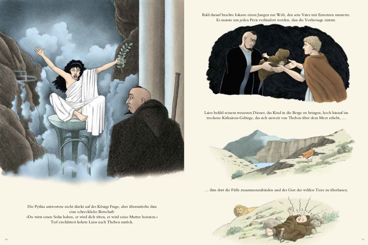 „Mama, können wir das Buch mit der Frau mit dem Löwenkörper lesen, wo der Mann sich selber die Augen aussticht?“ – zugegeben, griechische Sagen im Allgemeinen und Ödipus das Findelkind im Speziellen sind nichts für schwache Nerven. Monsieur 3 liebt es! 🙂